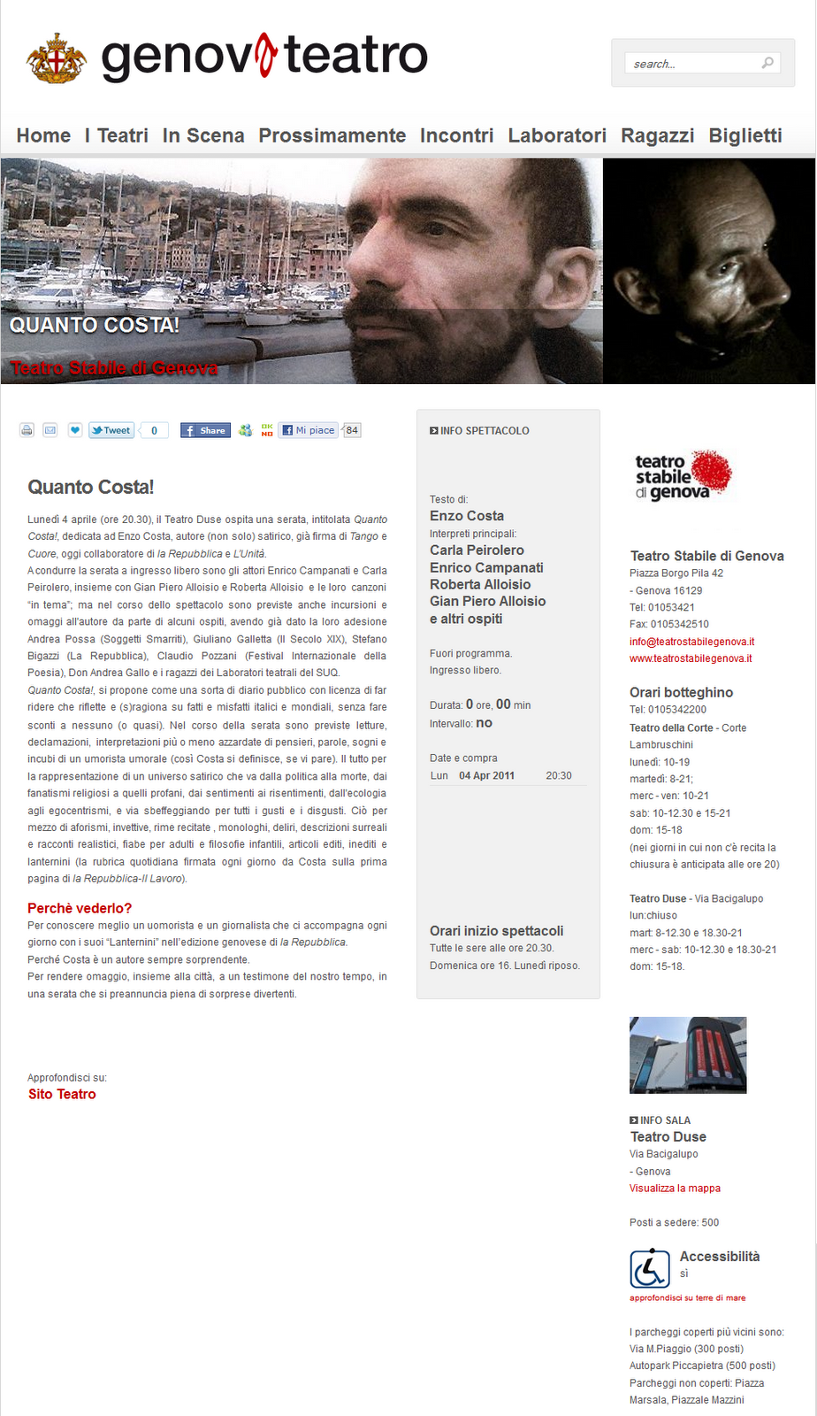 ospiti, avendo già dato la loro adesione Andrea Possa (Soggetti Smarriti), Giuliano Galletta (Il Secolo XIX), Stefano Bigazzi (La Repubblica), Claudio Pozzani (Festival Internazionale della Poesia), Don Andrea Gallo e i ragazzi dei Laboratori teatrali del SUQ. Quanto Costa!, si propone come una sorta di diario pubblico